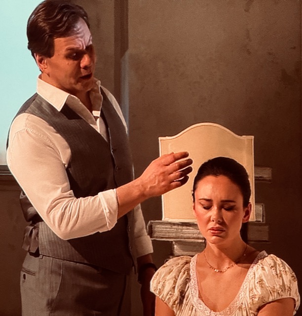 Much of the action centres around Tatiana’s bedroom. She’s a bookworm, lost in romantic novels, and clearly more at home in fiction than in real life. She meets and falls in love with Eugene Onegin — a terrible choice, frankly, for a naïve country girl. She writes him a letter, pouring out her love. He responds by rejecting her, plunging poor Tatiana into despair.